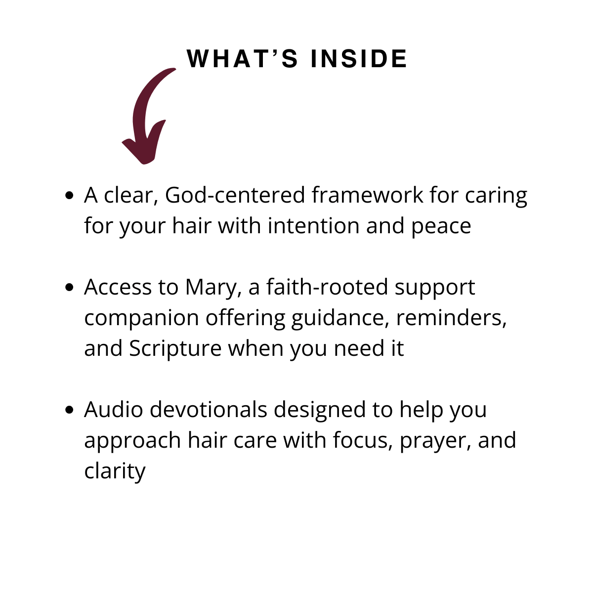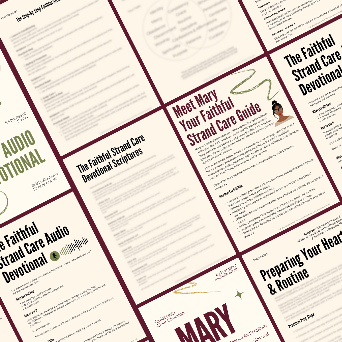 A: Mary is an AI-based support companion designed to reinforce the principles in this collection. She provides Scripture, reminders, and guidance to help you stay grounded in a faith-centered approach to your hair care.